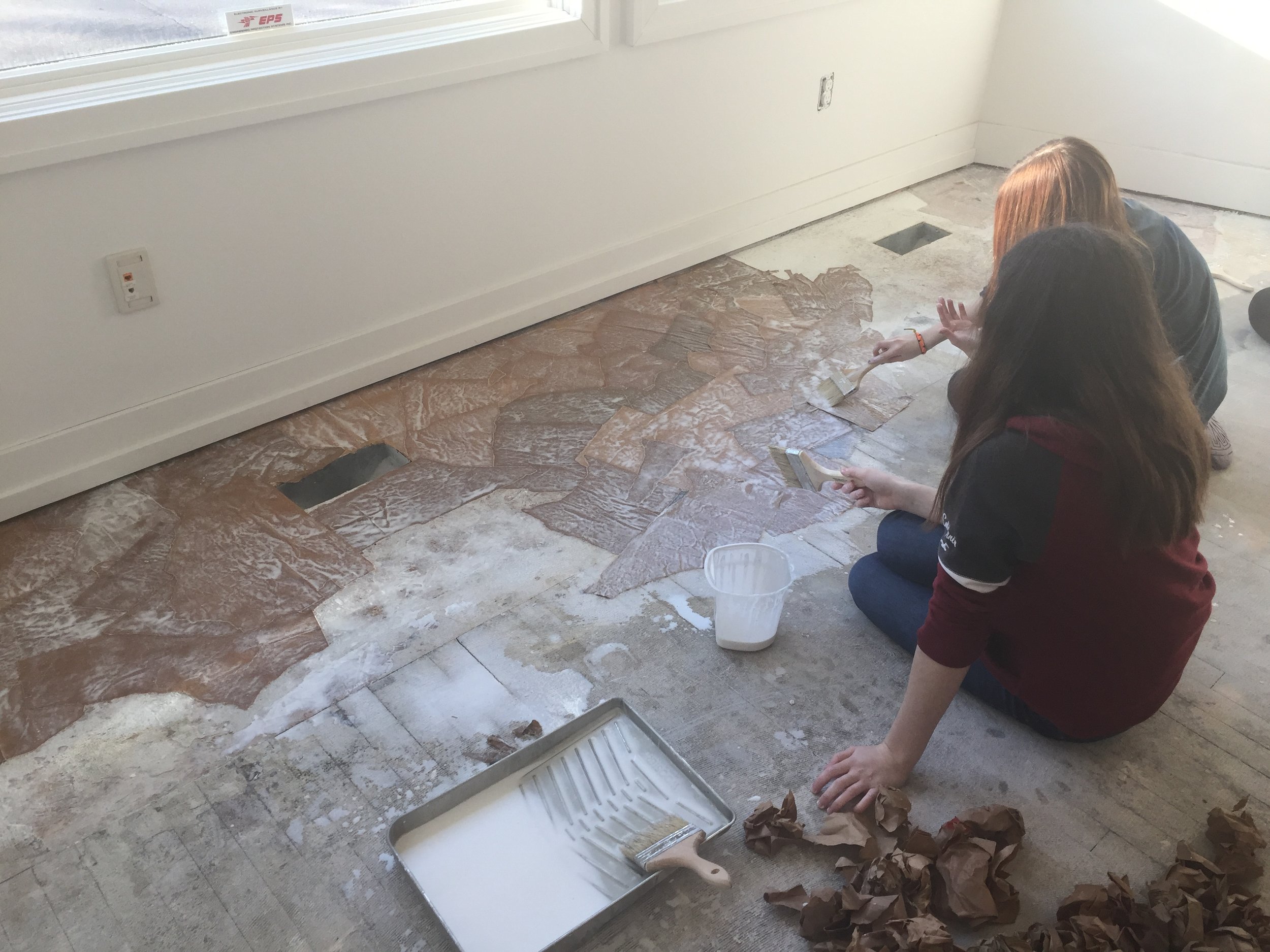 Step 3. With a paint brush we applied the glue mixture to the subfloor starting along one corner of the room & giving us the ability to work our way out. We used bags along the wall that had straight edges, whereas, through the rest of the room we tried to avoid edges. We also made sure that any bag logos or writing was facing downward and not visible to the eye. In the paint bucket, roller pan, or whatever you are using to store your glue in, we dipped the entire piece of paper leaving it saturated in the mixture and ready to adhere to the floor. We laid each piece and flattened it out making sure there were no bubbles or creases.